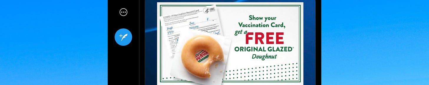 If you look at the following image of a donut, this is what this company and others are offering as an incentive to take a vaccine. This is what multiple companies are doing right now to give an incentive, if you could say coerce people into getting a vaccine